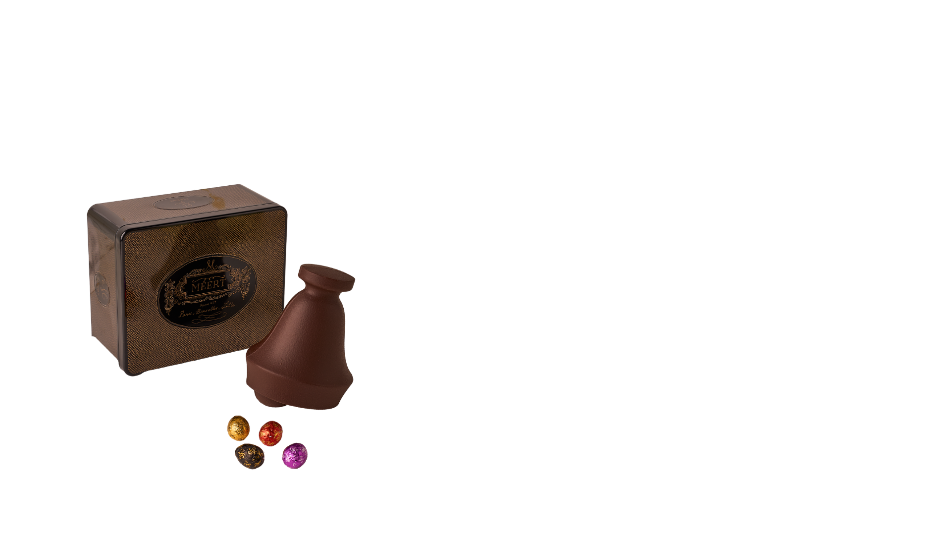 Cloche en chocolat noir garnie d'un assortiment de petits oeufs (chocolat au lait, noir et blanc).